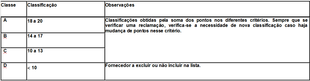 Os vários fornecedores são classificados com base nos seguintes critérios: