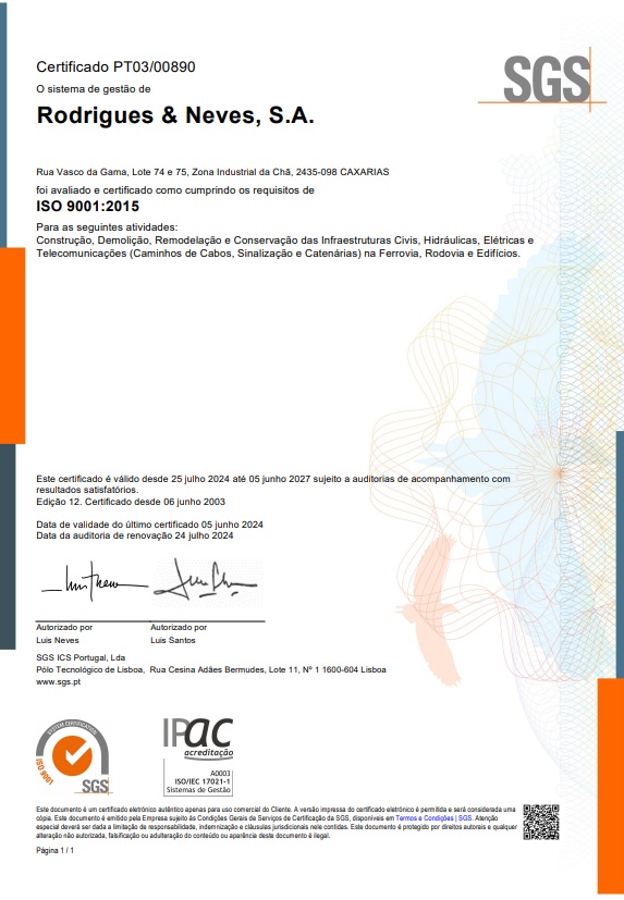 A Empresa RODRIGUES & NEVES define como âmbito para o seu Sistema de Gestão da Qualidade: “ Construção, Demolição, Remodelação e Conservação das infraestruturas civis, hidráulicas, eléctricas e telecomunicações (caminho de cabos, sinalização e catenárias), na ferrovia, rodovia e edifícios”